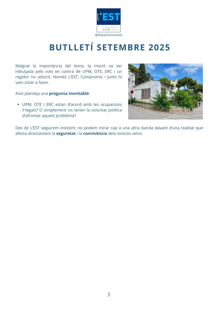 Des de L’EST, conjuntament amb Compromís, vam presentar al Ple una moció per fer front a les ocupacions il·legals, que cada vegada generen més problemes de convivència i inseguretat al nostre municipi.